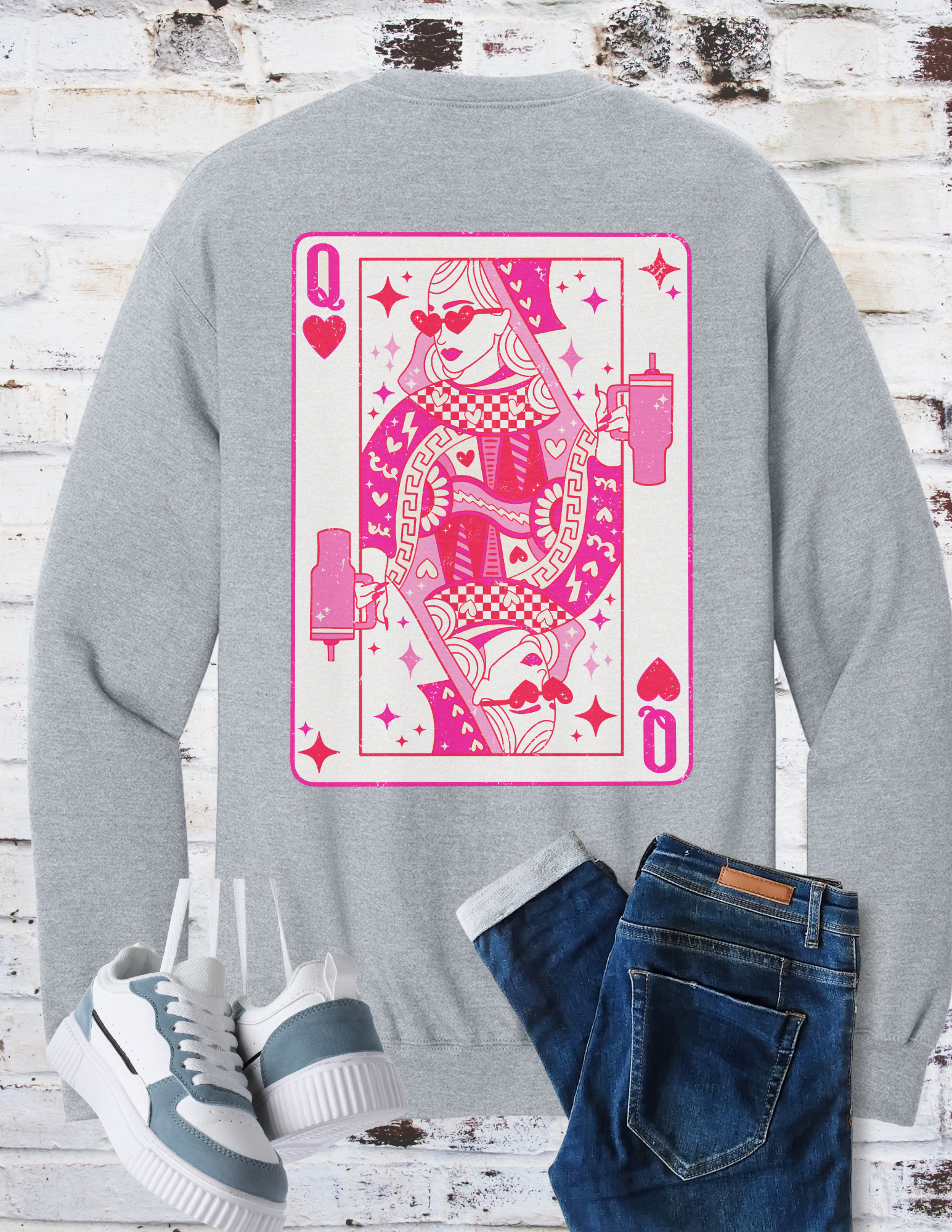 Not just for Valentine’s Day — this one’s a year-round favorite. Featuring a Q with hearts on the front left chest, and a bold Queen of Hearts card graphic on the back. But this queen? She’s wearing sunglasses and holding a Yeti — because royalty stays hydrated and unbothered.✔ Sport grey crewneck sweatshirt✔ Front chest mini graphic✔ Full back statement design✔ Perfect for gifting or keeping for yourself
